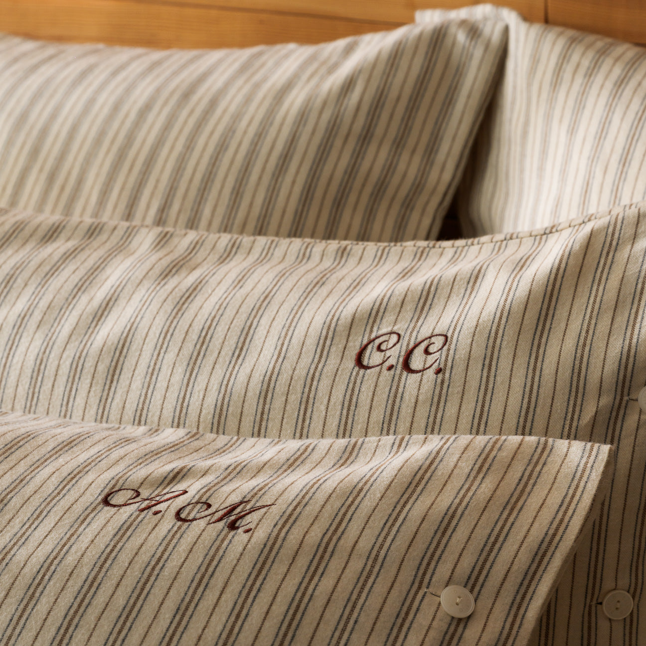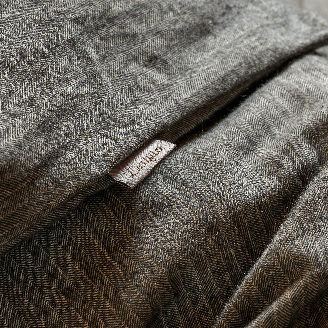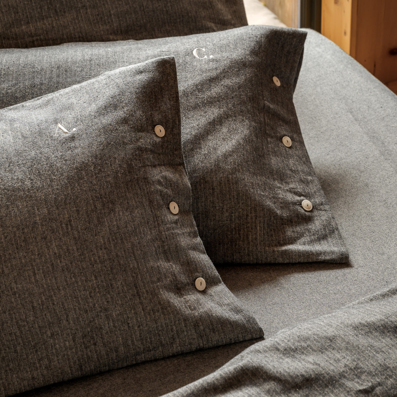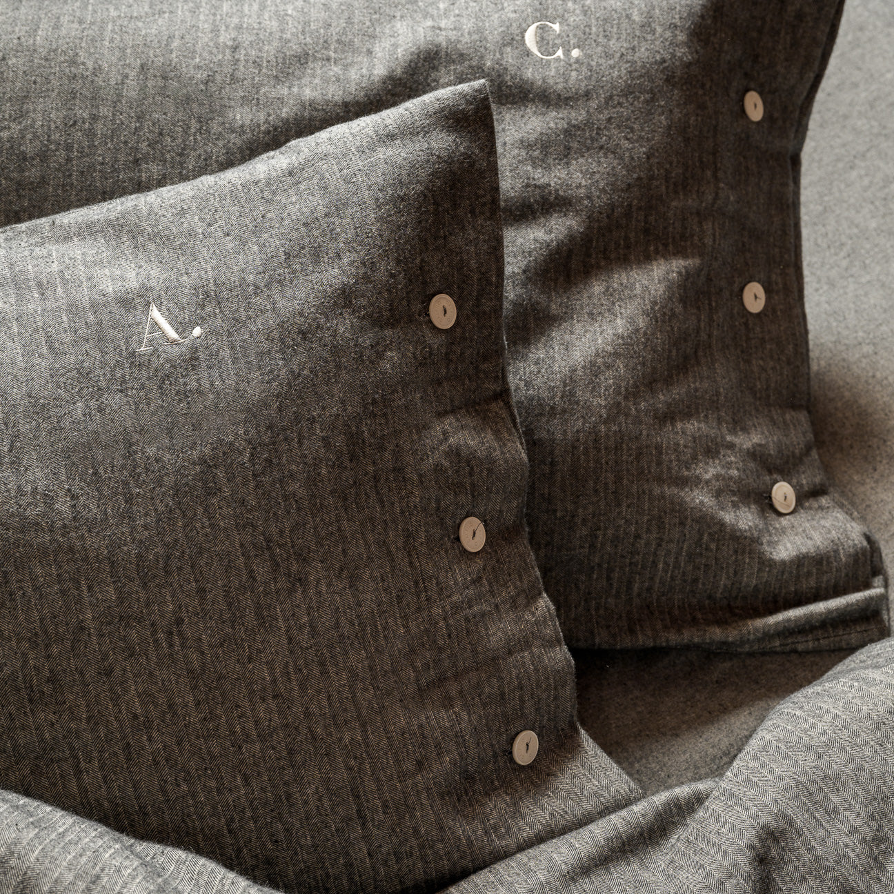 Ein hochwertiges, einzigartiges und handgefertigtes Produkt, super exklusiv und extra weich, entworfen und hergestellt in limitierter Auflage für die Saison FW 24-25. Erhältlich in zwei vielseitigen Varianten: CREMA GESTREIFT und ANTHRAZIT FISCHGRÄT, mit Knöpfen, die den Markennamen tragen, sowohl auf dem Bettbezug als auch auf den Kissenbezügen.