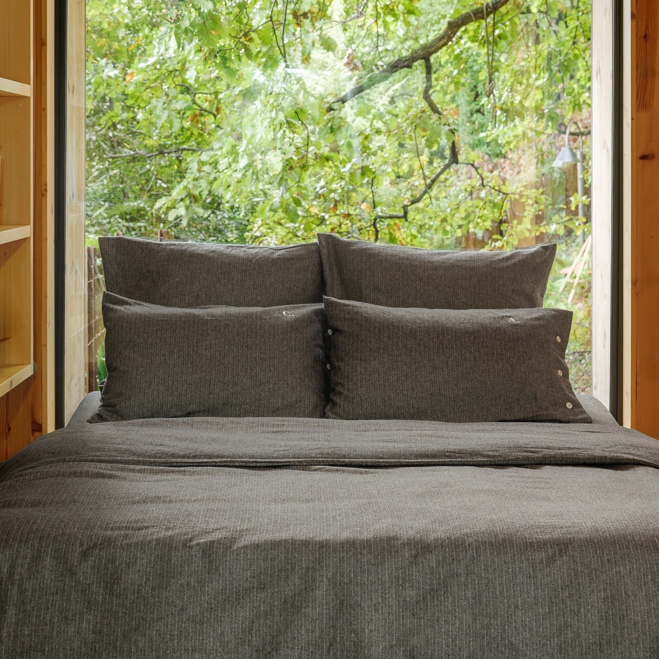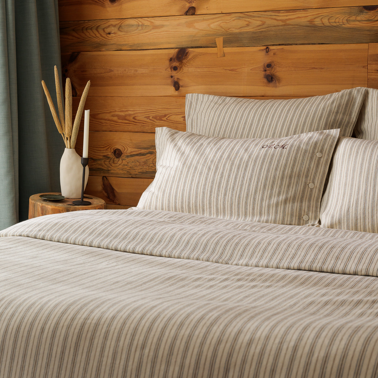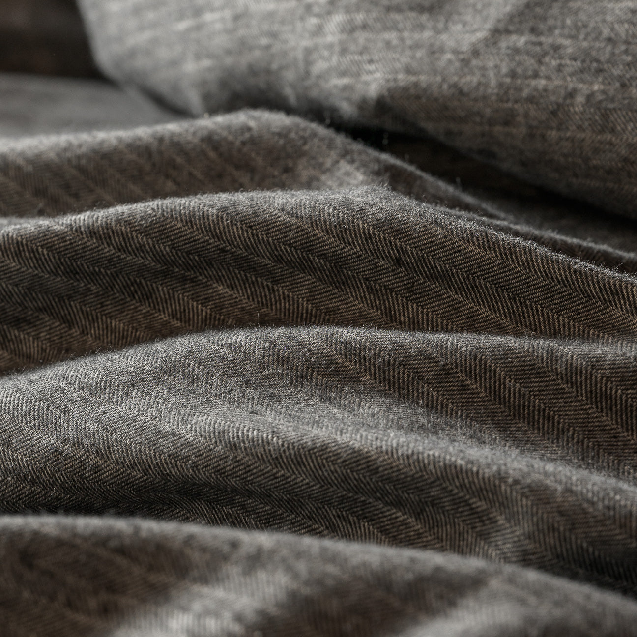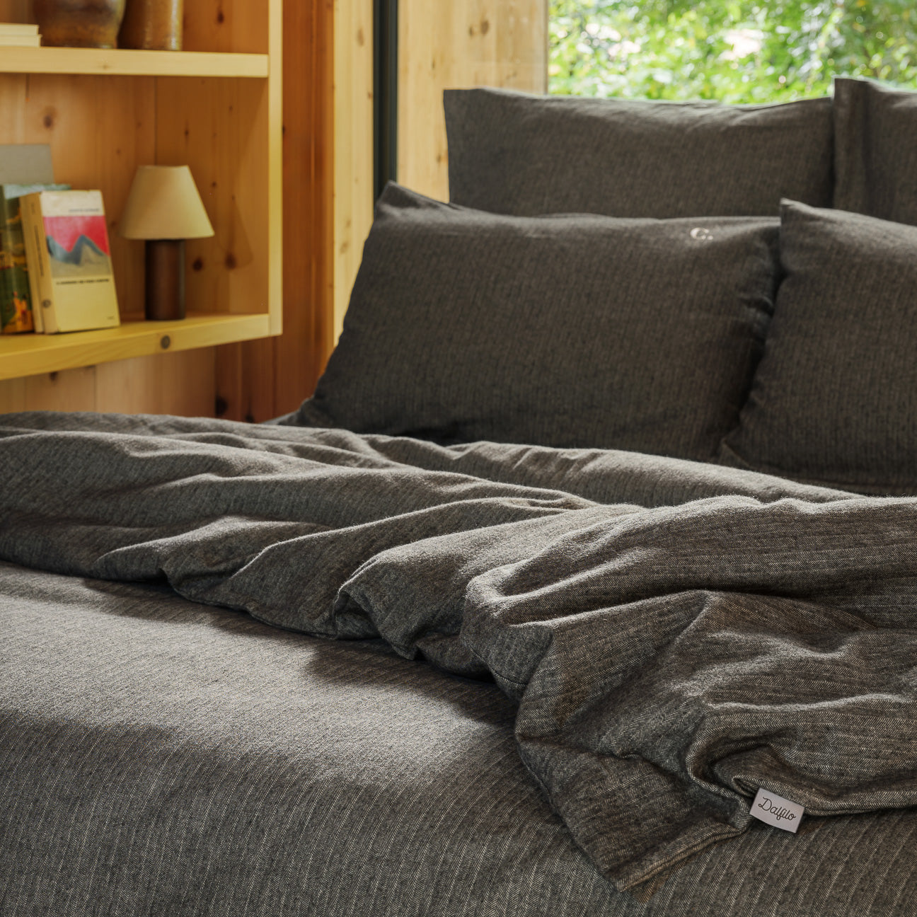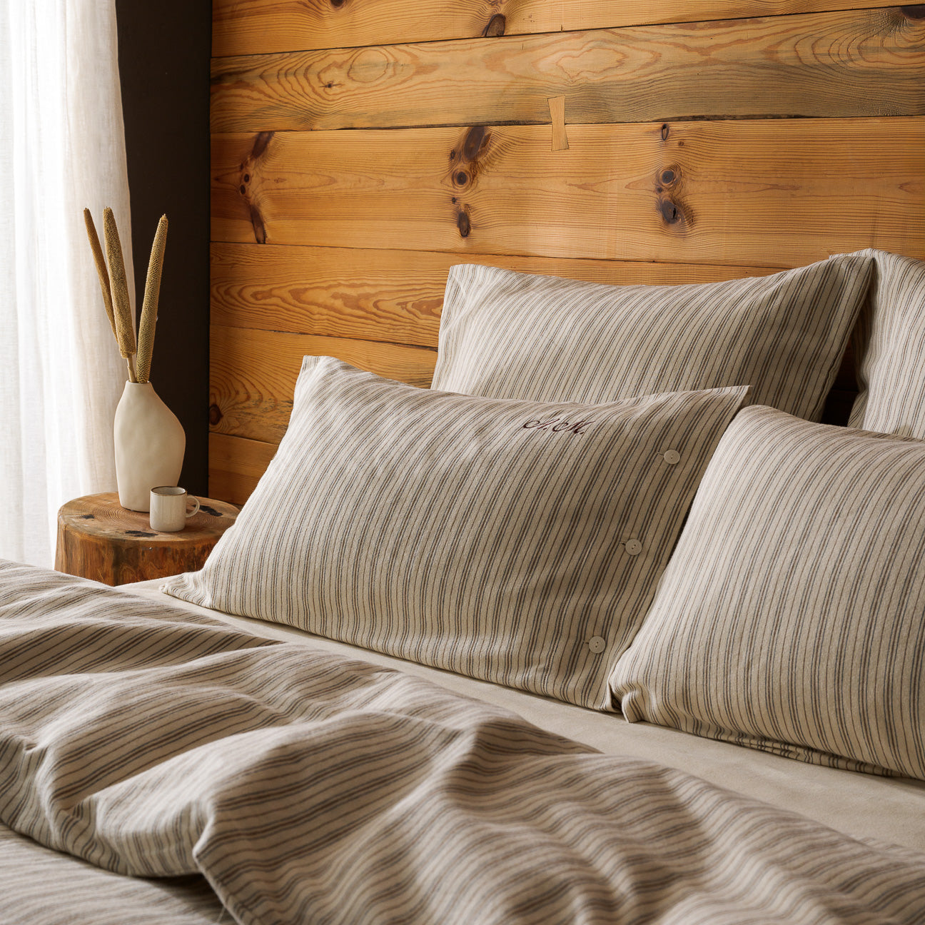 Ein hochwertiges, einzigartiges und handgefertigtes Produkt, super exklusiv und extra weich, entworfen und hergestellt in limitierter Auflage für die Saison FW 24-25. Erhältlich in zwei vielseitigen Varianten: CREMA GESTREIFT und ANTHRAZIT FISCHGRÄT, mit Knöpfen, die den Markennamen tragen, sowohl auf dem Bettbezug als auch auf den Kissenbezügen.
