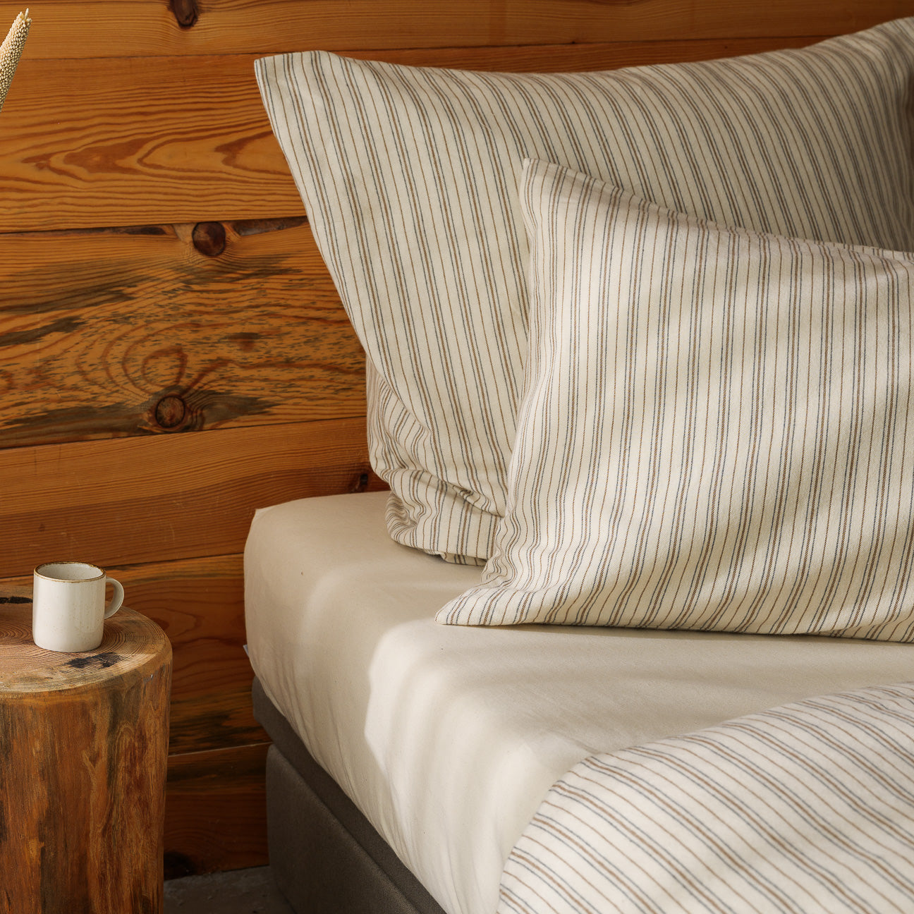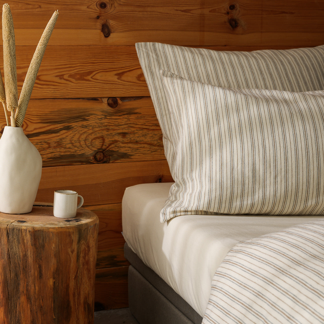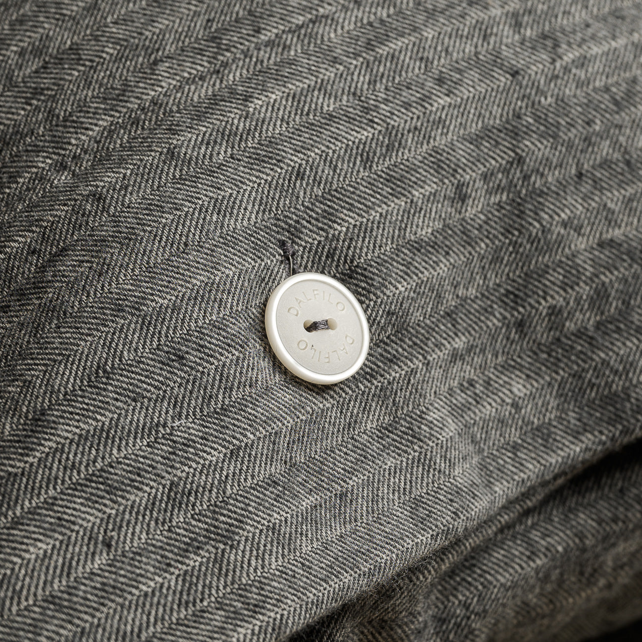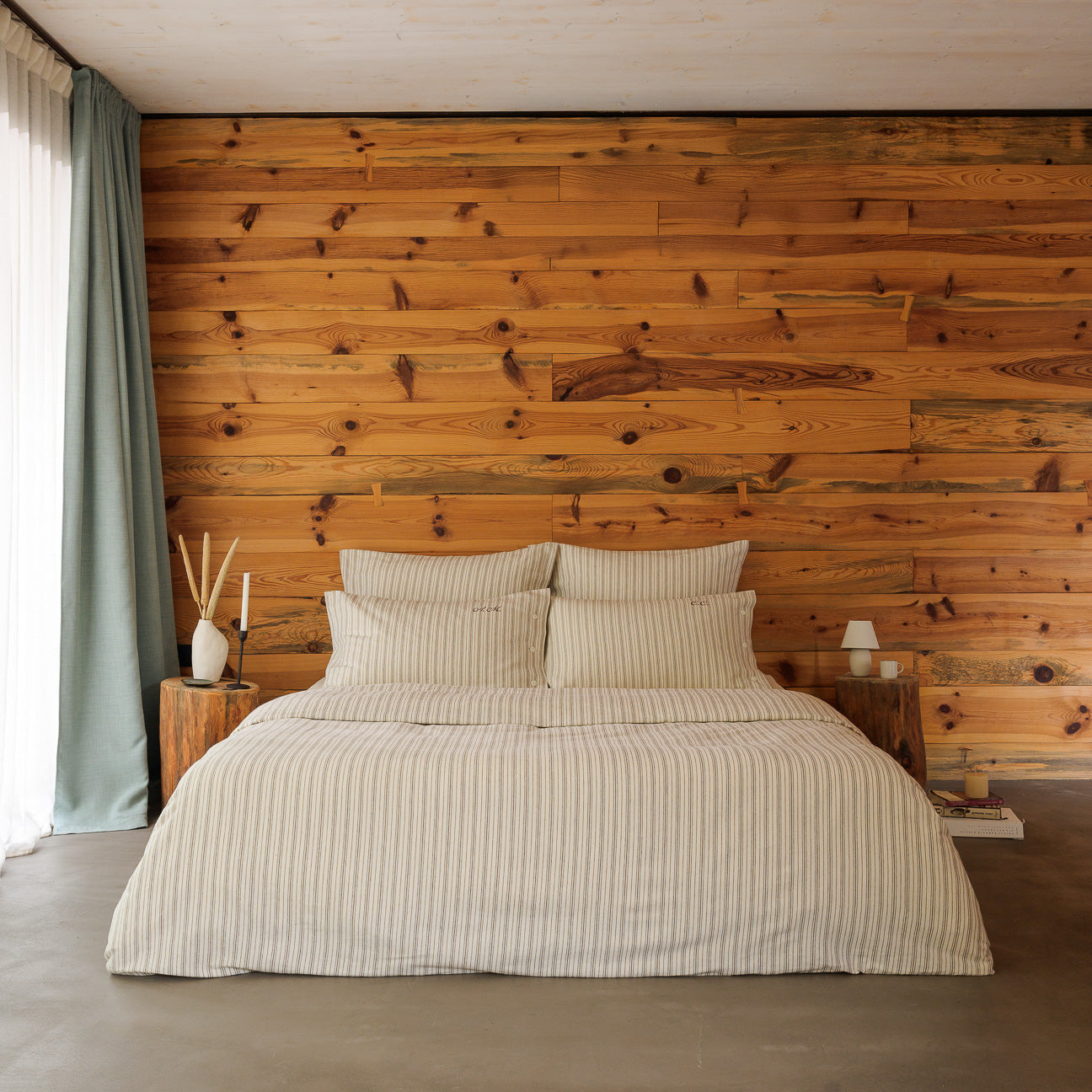 Ein hochwertiges, einzigartiges und handgefertigtes Produkt, super exklusiv und extra weich, entworfen und hergestellt in limitierter Auflage für die Saison FW 24-25. Erhältlich in zwei vielseitigen Varianten: CREMA GESTREIFT und ANTHRAZIT FISCHGRÄT, mit Knöpfen, die den Markennamen tragen, sowohl auf dem Bettbezug als auch auf den Kissenbezügen.
