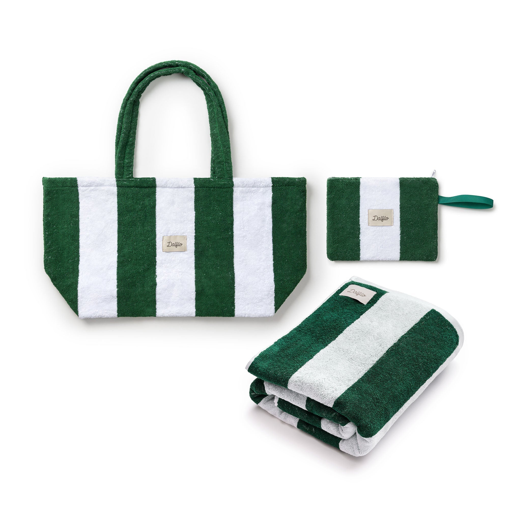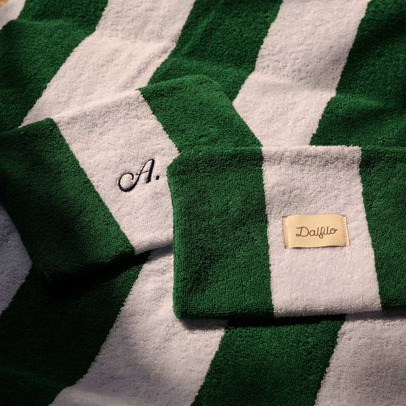- Portofino-Strandtasche: 47 x 50 x 19 cm, ungefüttert, geräumig und leicht, mit farblich abgestimmten Frottee-Henkeln, Dalfilo-Etikett auf der Vorderseite und personalisierbarer Stickerei auf der Rückseite.