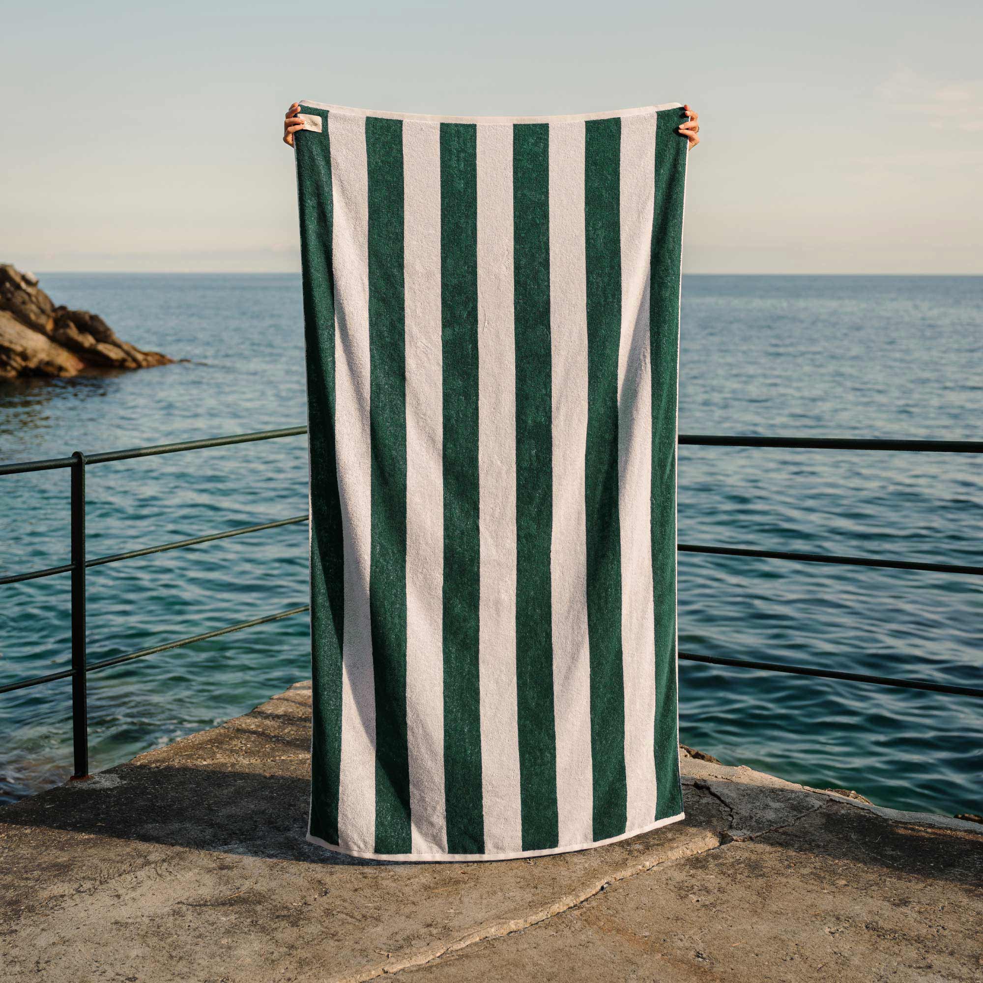 - Portofino-Strandtuch: 100 x 180 cm, aus reiner Baumwollfrottee (450 g/m²), mit 2 cm weißem Satinsaum und Stickoption zur Personalisierung.