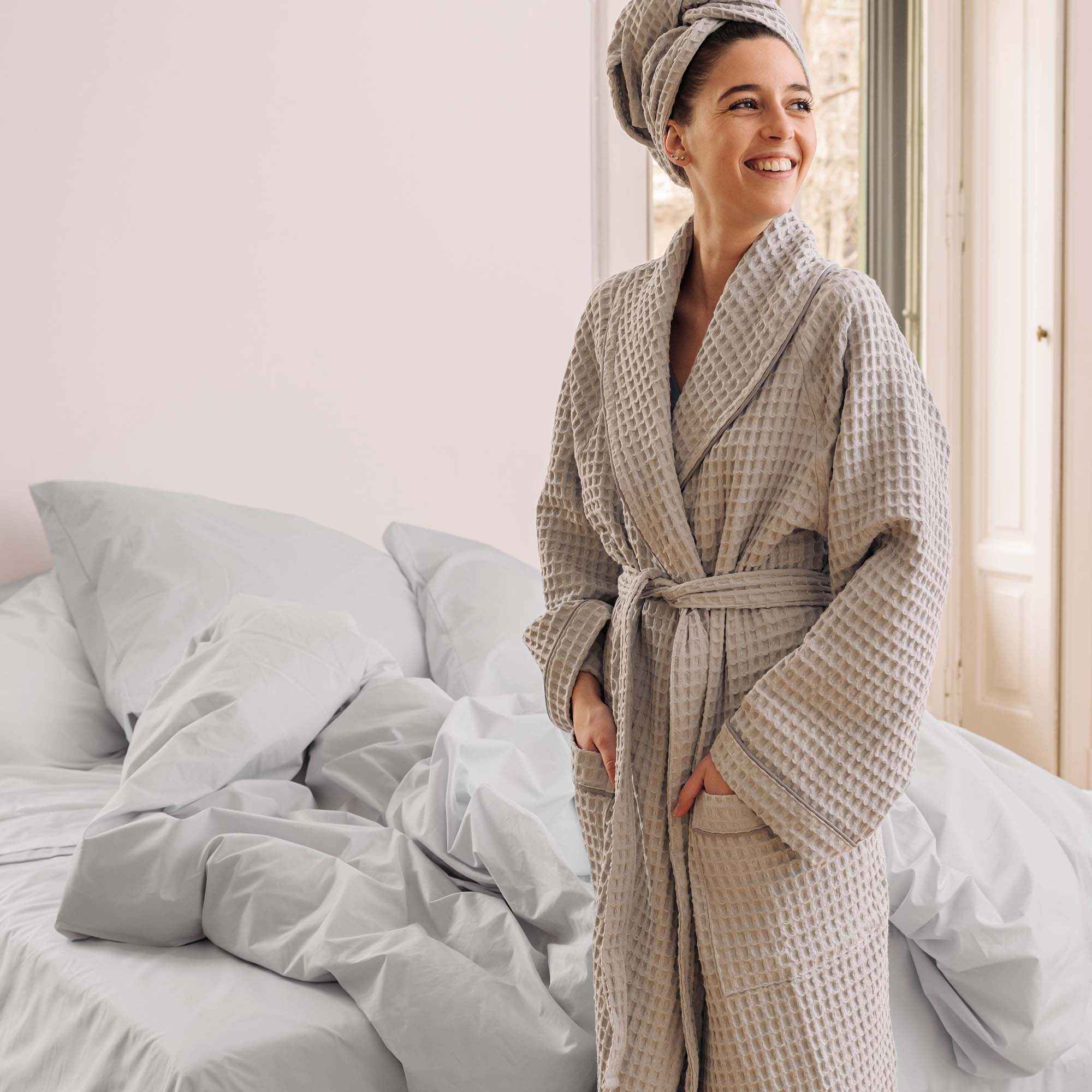 Zeitloses Design: Die klassische Waffelpiqué-Struktur verleiht dem Bademantel ein elegantes und zugleich modernes Aussehen, das nie aus der Mode kommt.