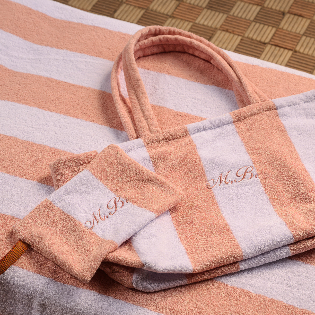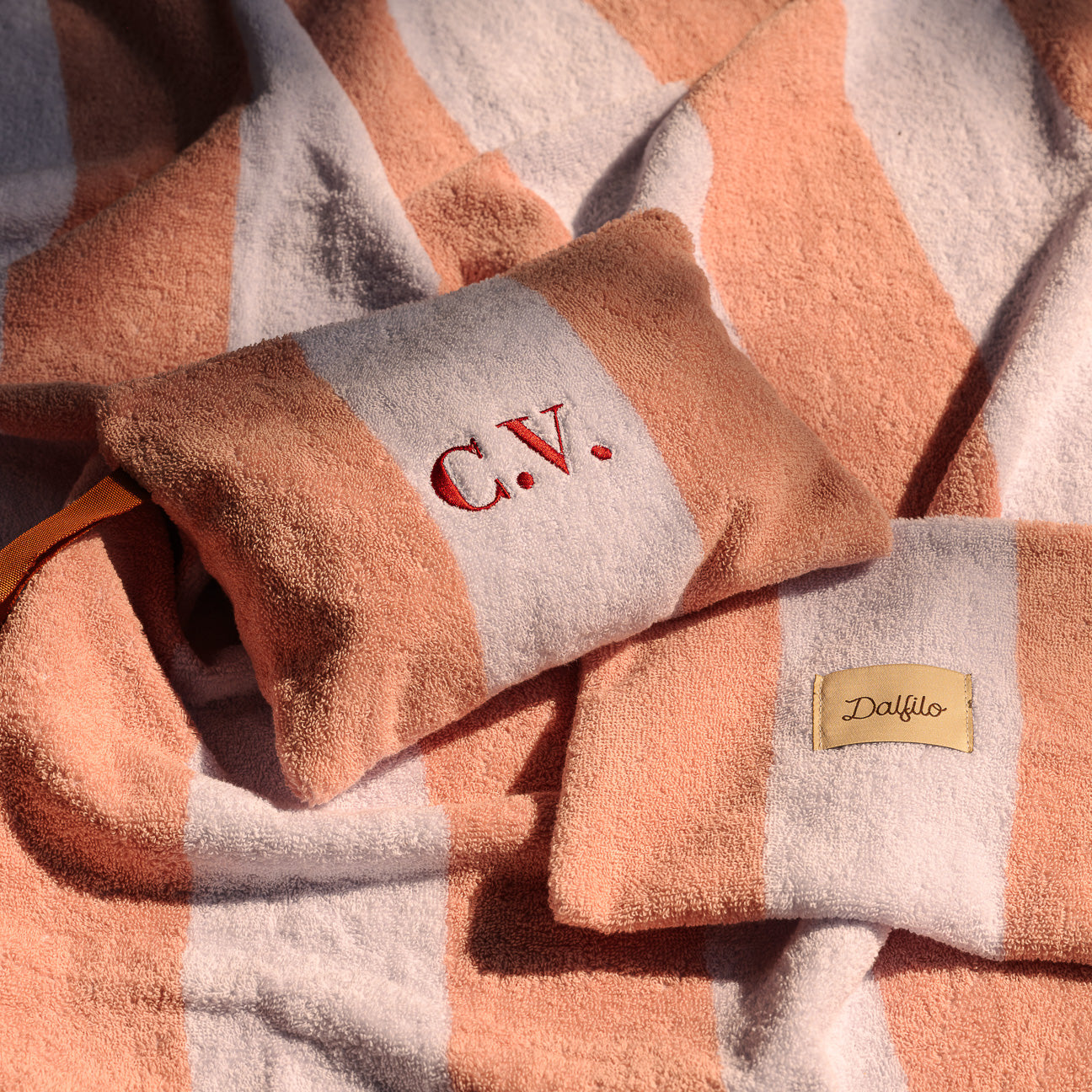 Unlike traditional digitally printed fabrics, our bath towel is made on a loom by interweaving white and colored threads. The colored threads are previously dyed and then processed in jacquard style, creating a striped pattern that is reflected on the front and back. This handcrafted process allows a look at the interweaving of the different threads.