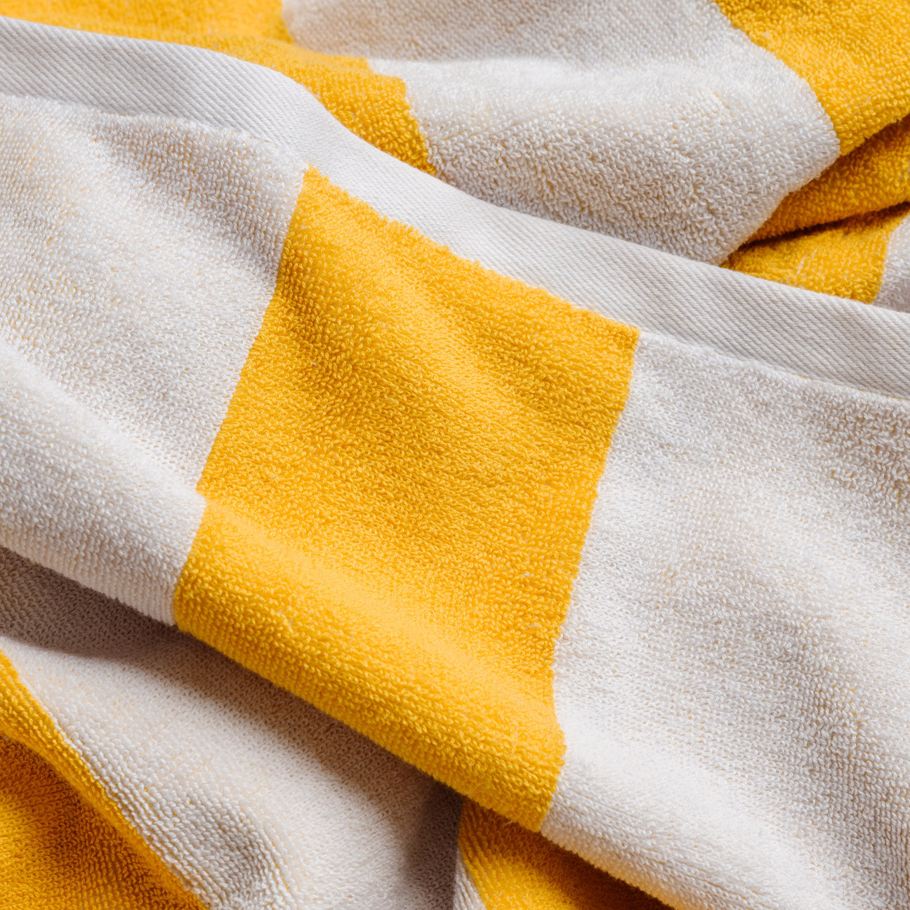Unlike traditional digitally printed fabrics, our bath towel is made on a loom by interweaving white and colored threads. The colored threads are previously dyed and then processed in jacquard style, creating a striped pattern that is reflected on the front and back. This handcrafted process allows a look at the interweaving of the different threads.