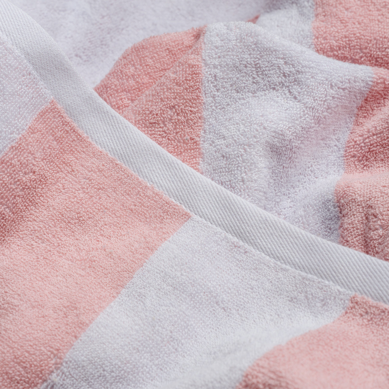 Unlike traditional digitally printed fabrics, our bath towel is made on a loom by interweaving white and colored threads. The colored threads are previously dyed and then processed in jacquard style, creating a striped pattern that is reflected on the front and back. This handcrafted process allows a look at the interweaving of the different threads.