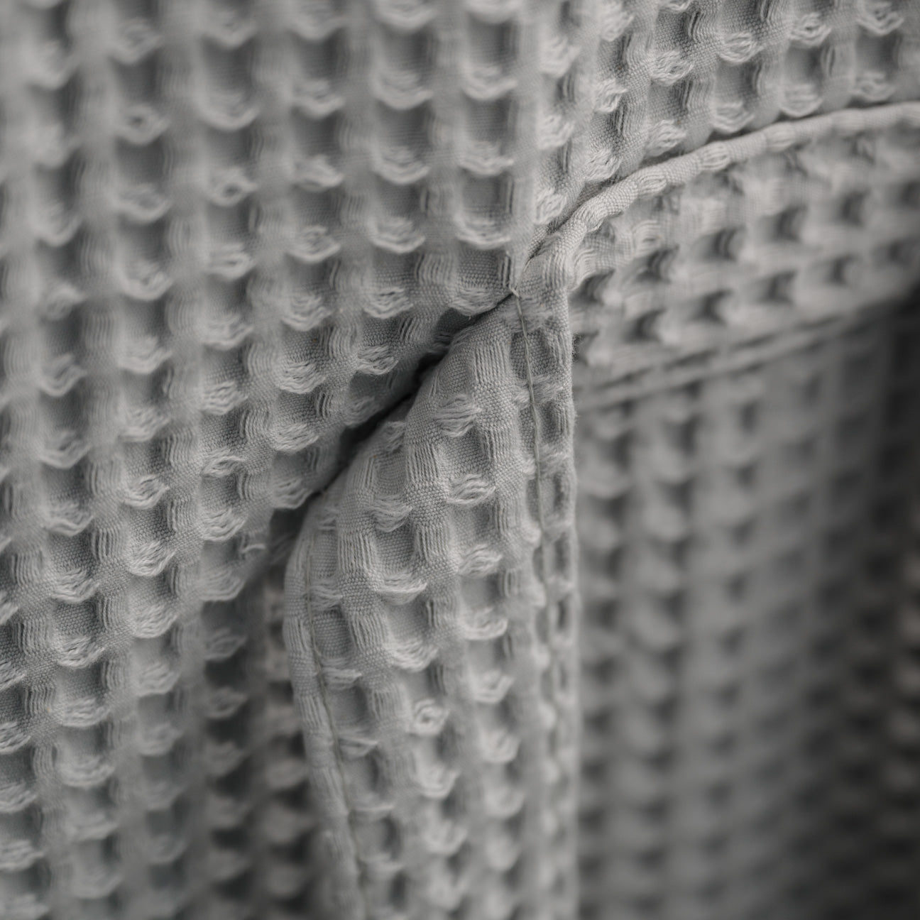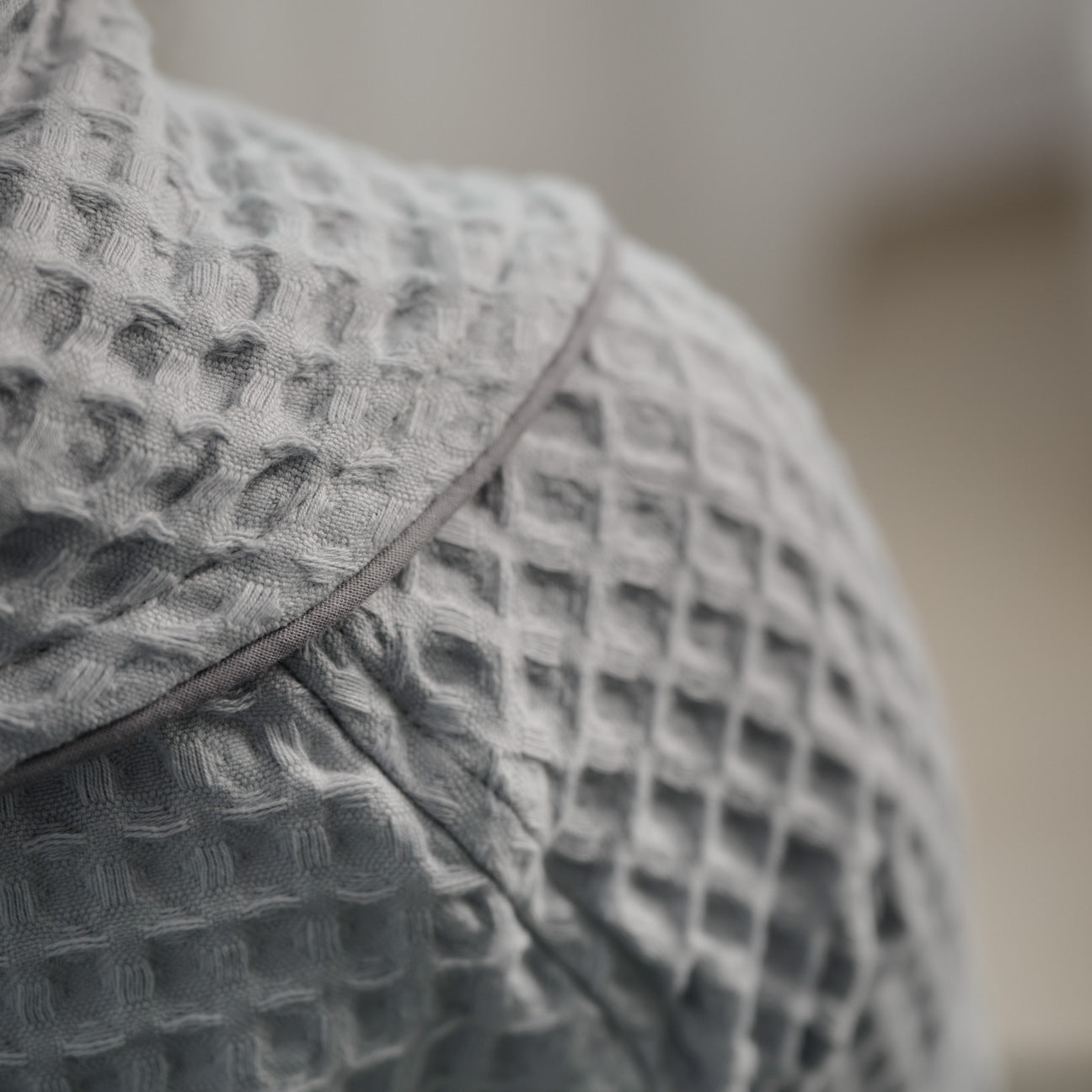 The Waffle Piqué line features a 380 g/m2 pure cotton terry that has been specially processed to create a beehive-like appearance. This three-dimensional check structure guarantees maximum absorbency with minimal weight without sacrificing softness. The perfect line that accompanies you everywhere.