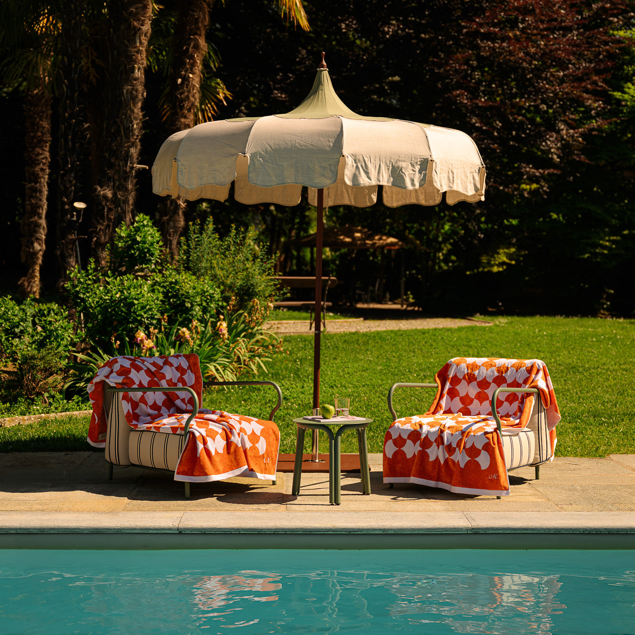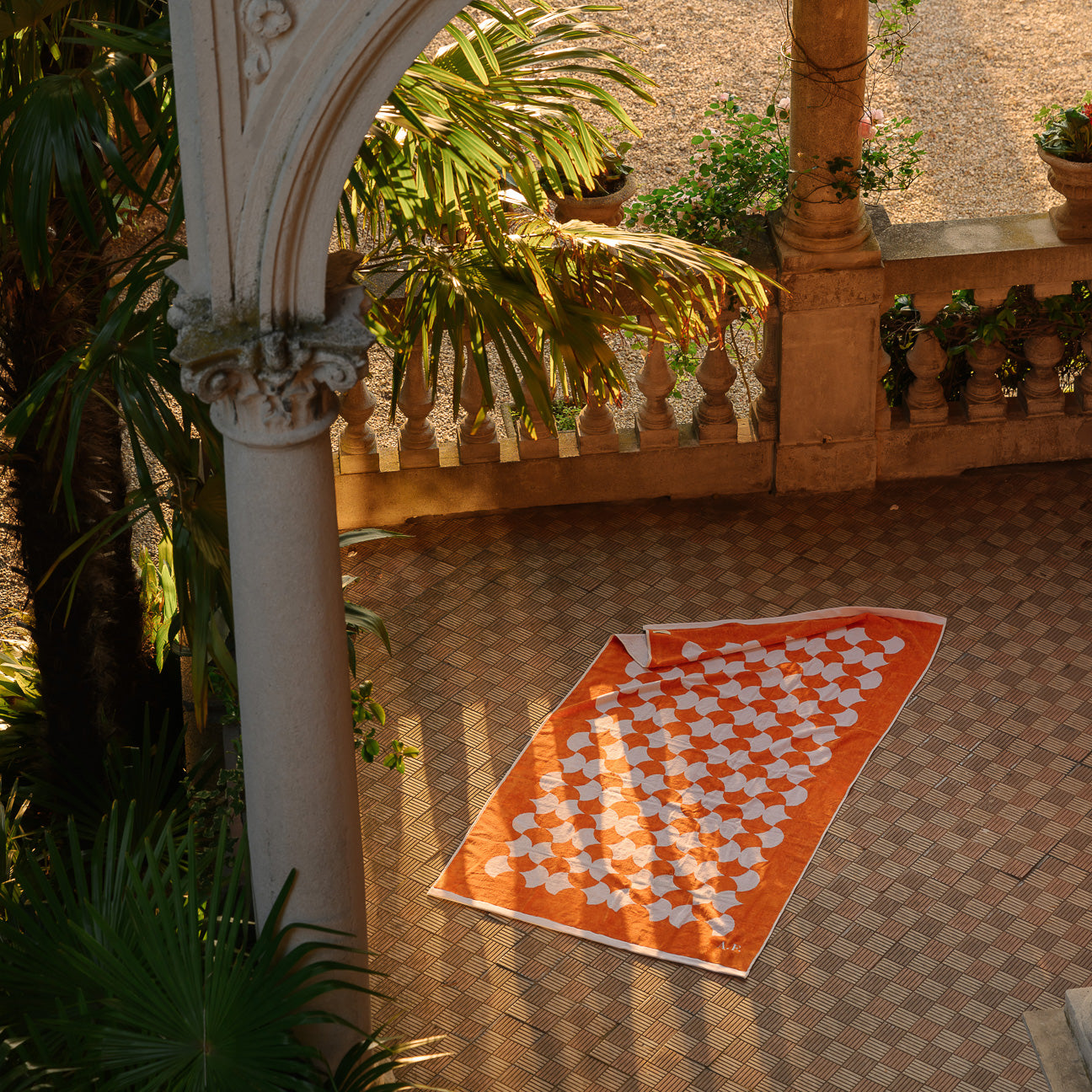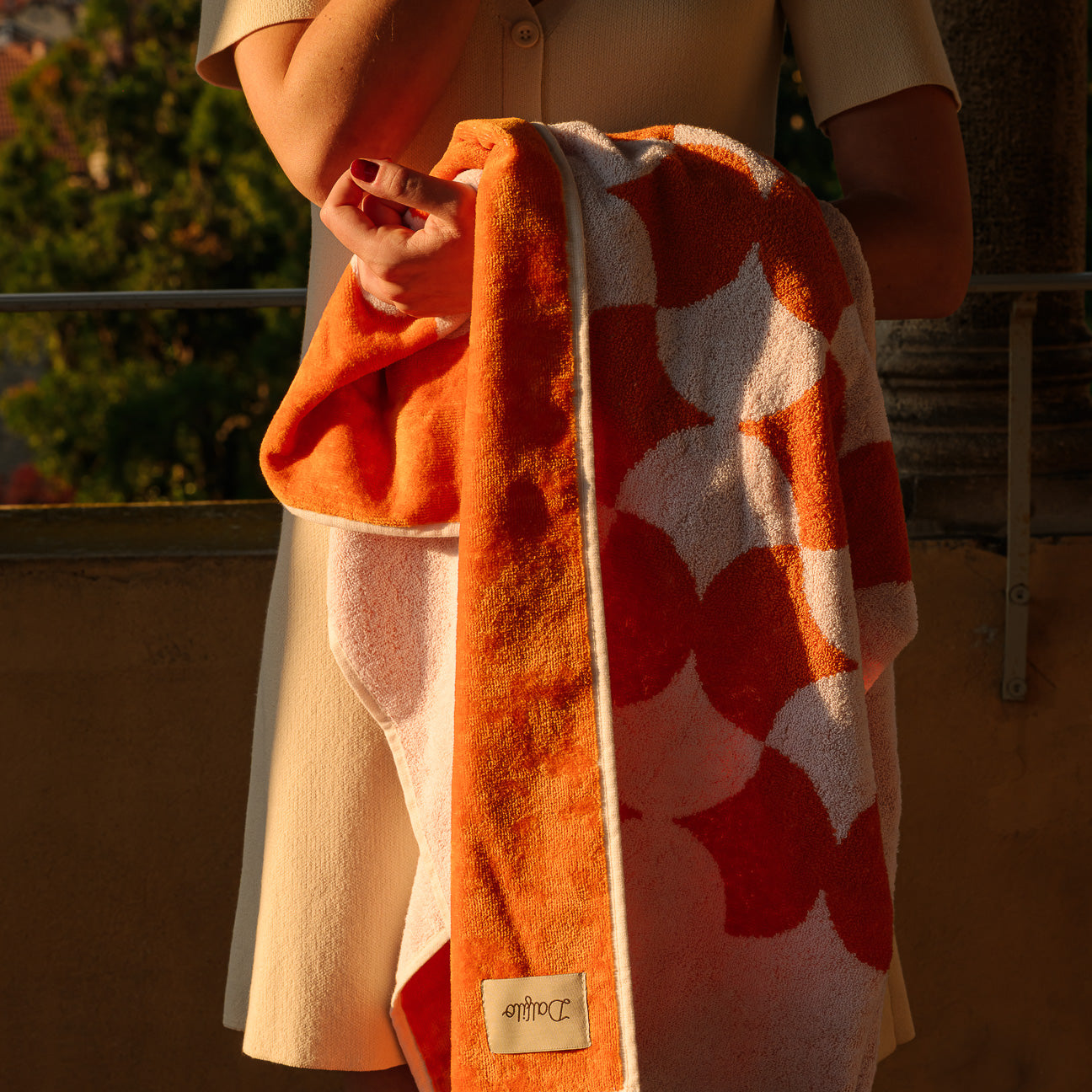 Unlike traditional digitally printed fabrics, our bath towel is made on a loom by interweaving white and colored threads. The colored threads are previously dyed and then processed in jacquard style, creating a striped pattern that is reflected on the front and back. This handcrafted process allows a look at the interweaving of the different threads.