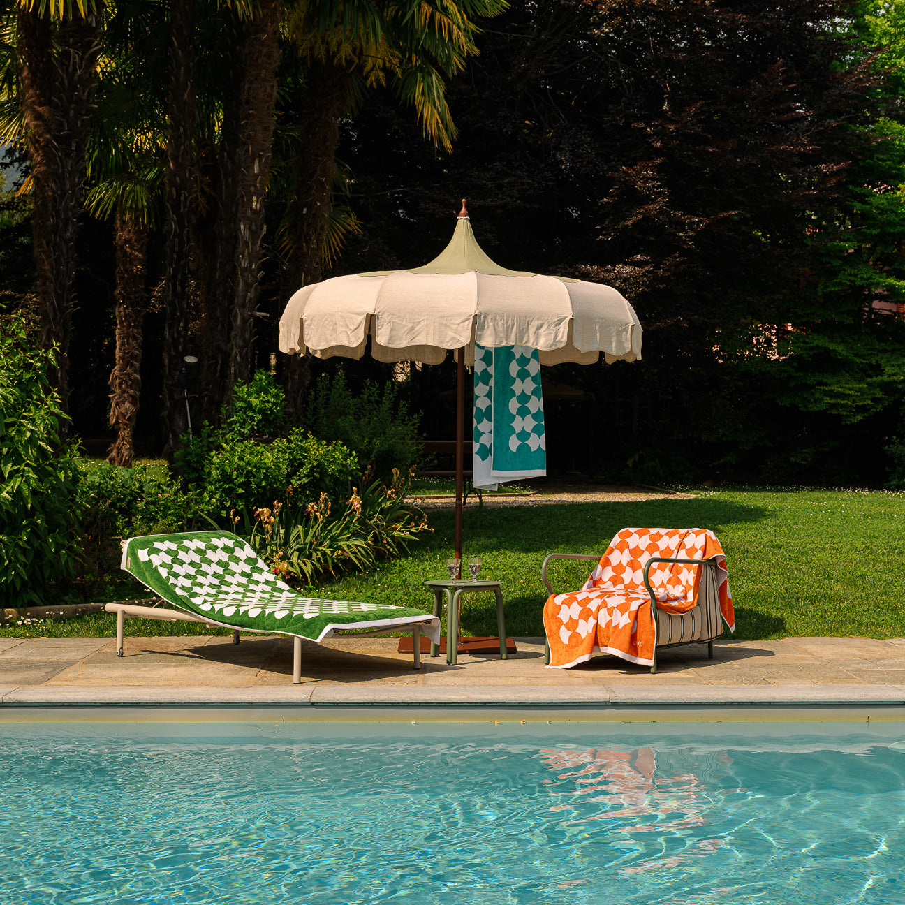 The dye chosen is indanthrene, which is highly resistant to sun, chlorine, weather and frequent washing.