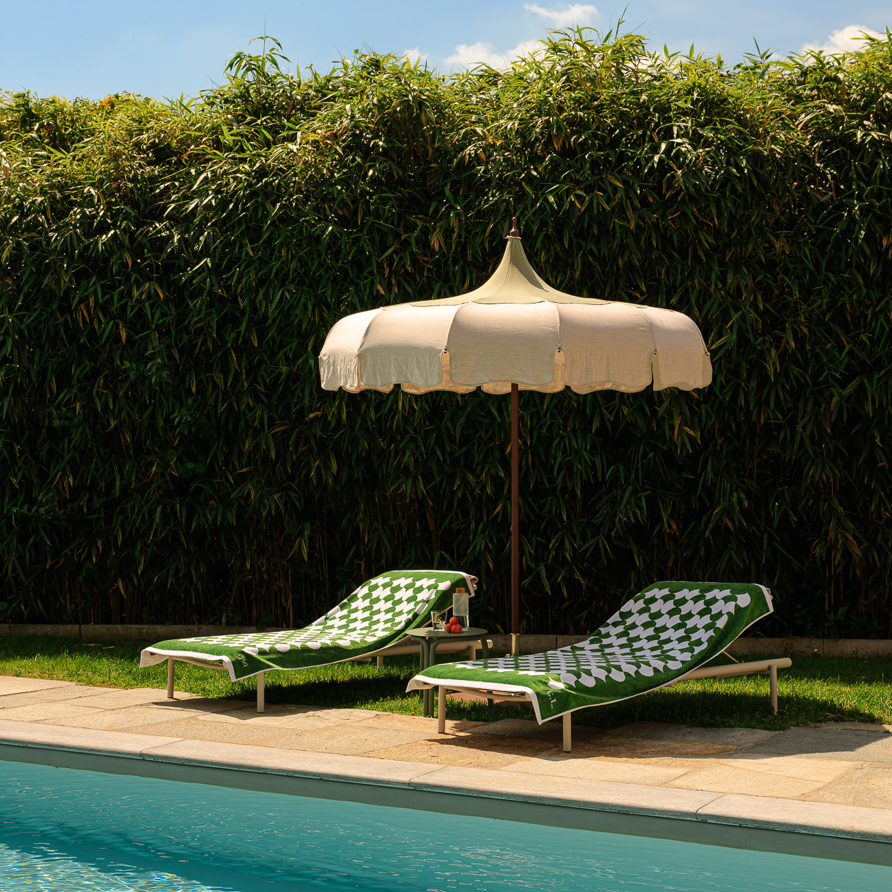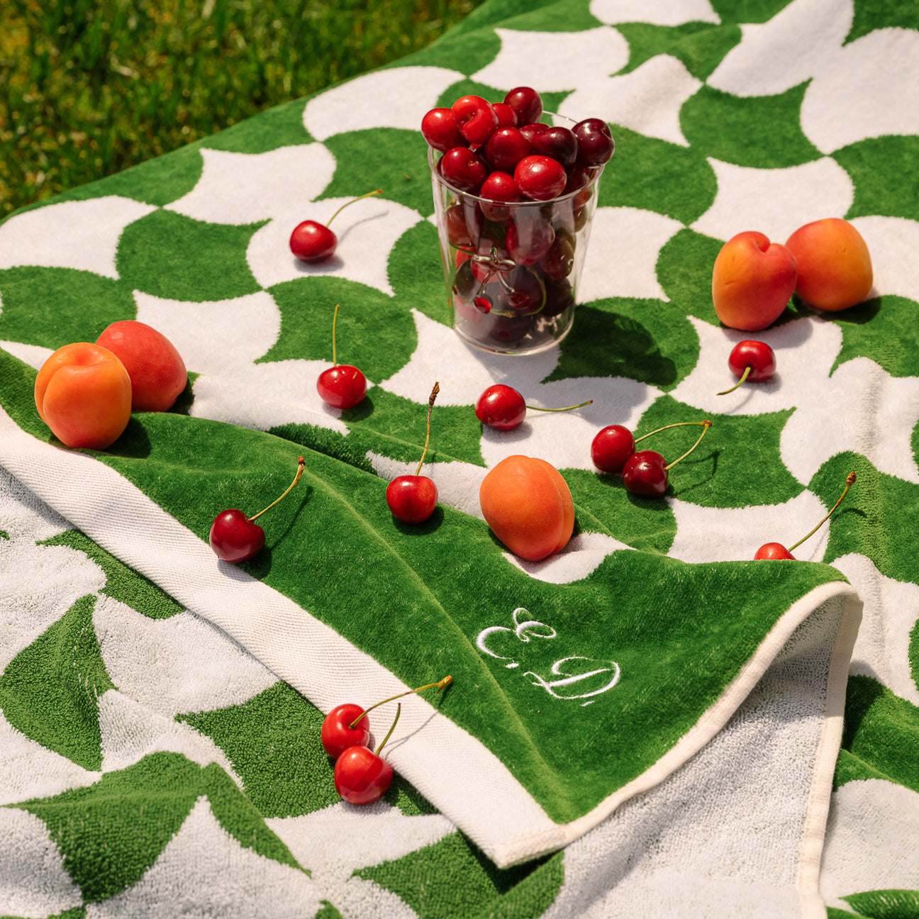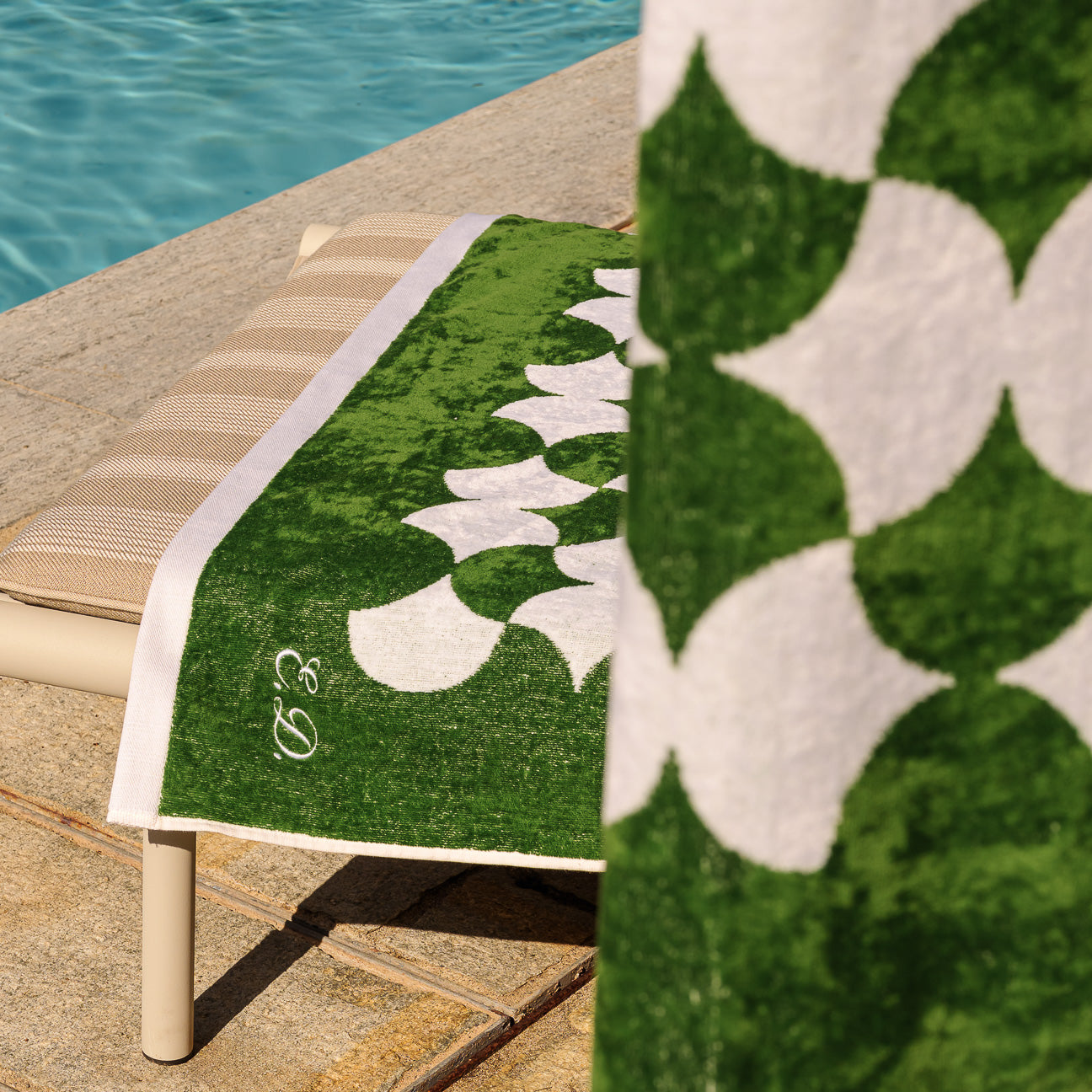 Unlike traditional digitally printed fabrics, our bath towel is made on a loom by interweaving white and colored threads. The colored threads are previously dyed and then processed in jacquard style, creating a striped pattern that is reflected on the front and back. This handcrafted process allows a look at the interweaving of the different threads.