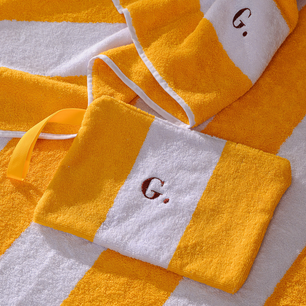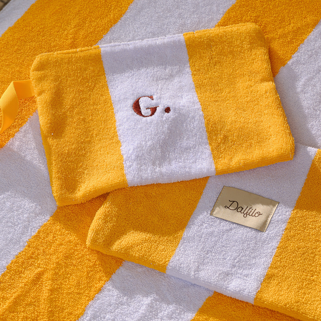Unlike traditional digitally printed fabrics, our bath towel is made on a loom by interweaving white and colored threads. The colored threads are previously dyed and then processed in jacquard style, creating a striped pattern that is reflected on the front and back. This handcrafted process allows a look at the interweaving of the different threads.