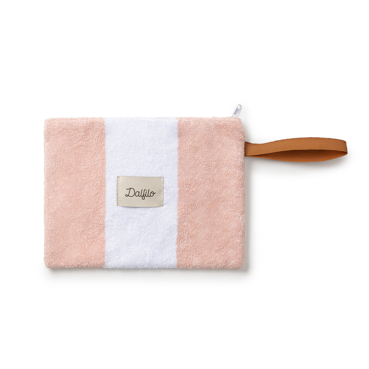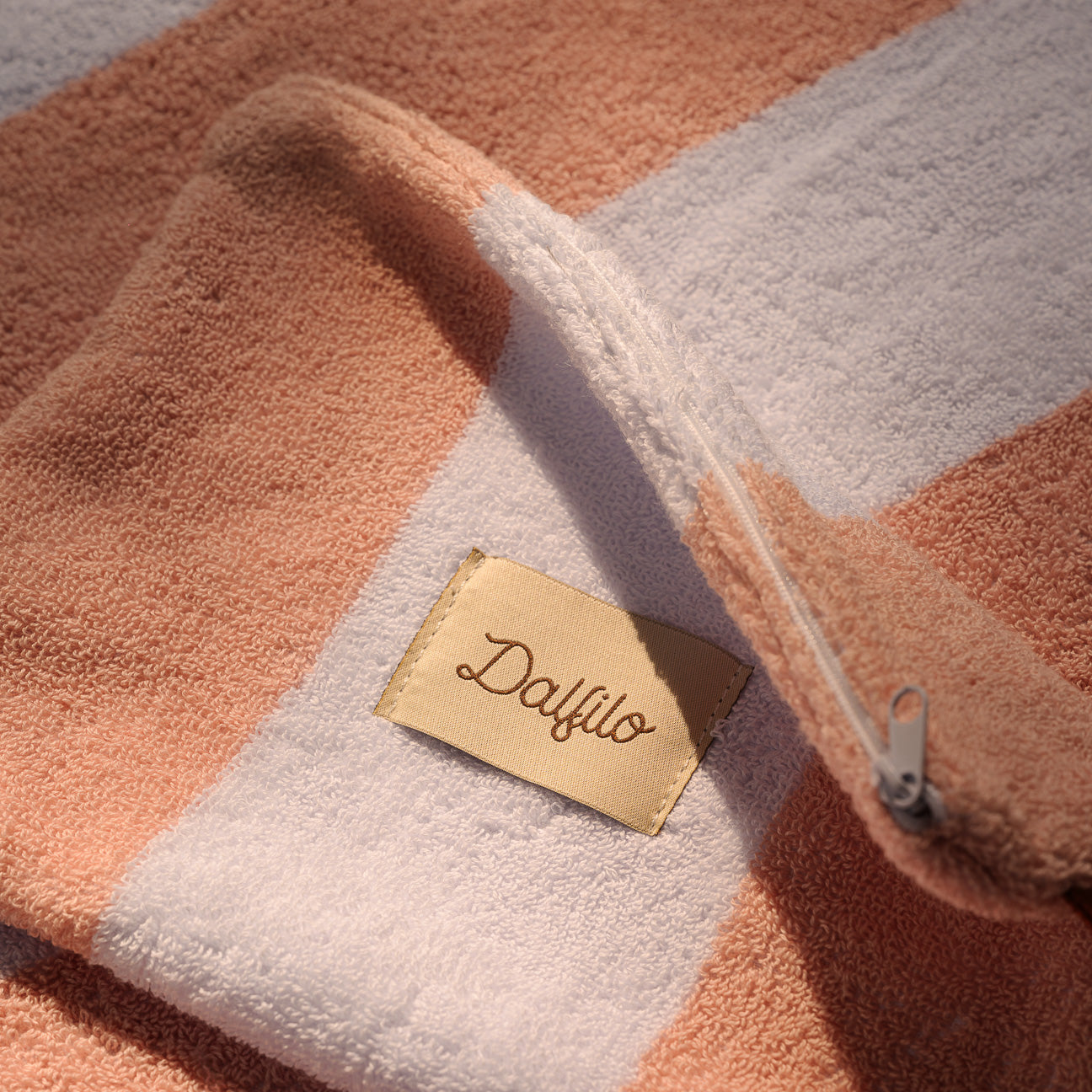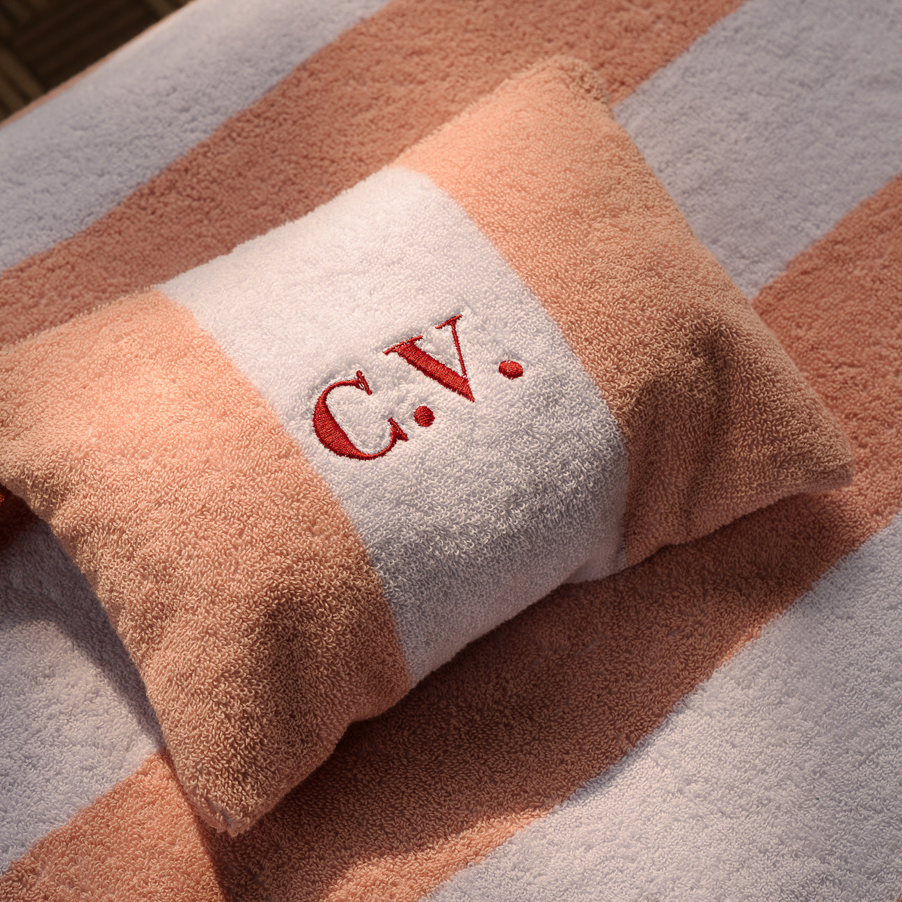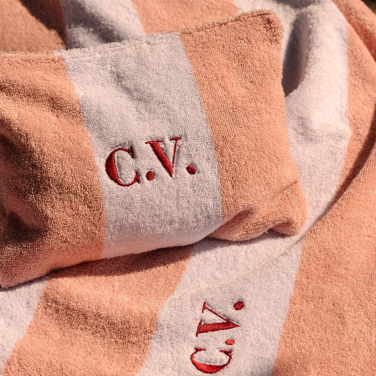 Unlike traditional digitally printed fabrics, our bath towel is made on a loom by interweaving white and colored threads. The colored threads are previously dyed and then processed in jacquard style, creating a striped pattern that is reflected on the front and back. This handcrafted process allows a look at the interweaving of the different threads.