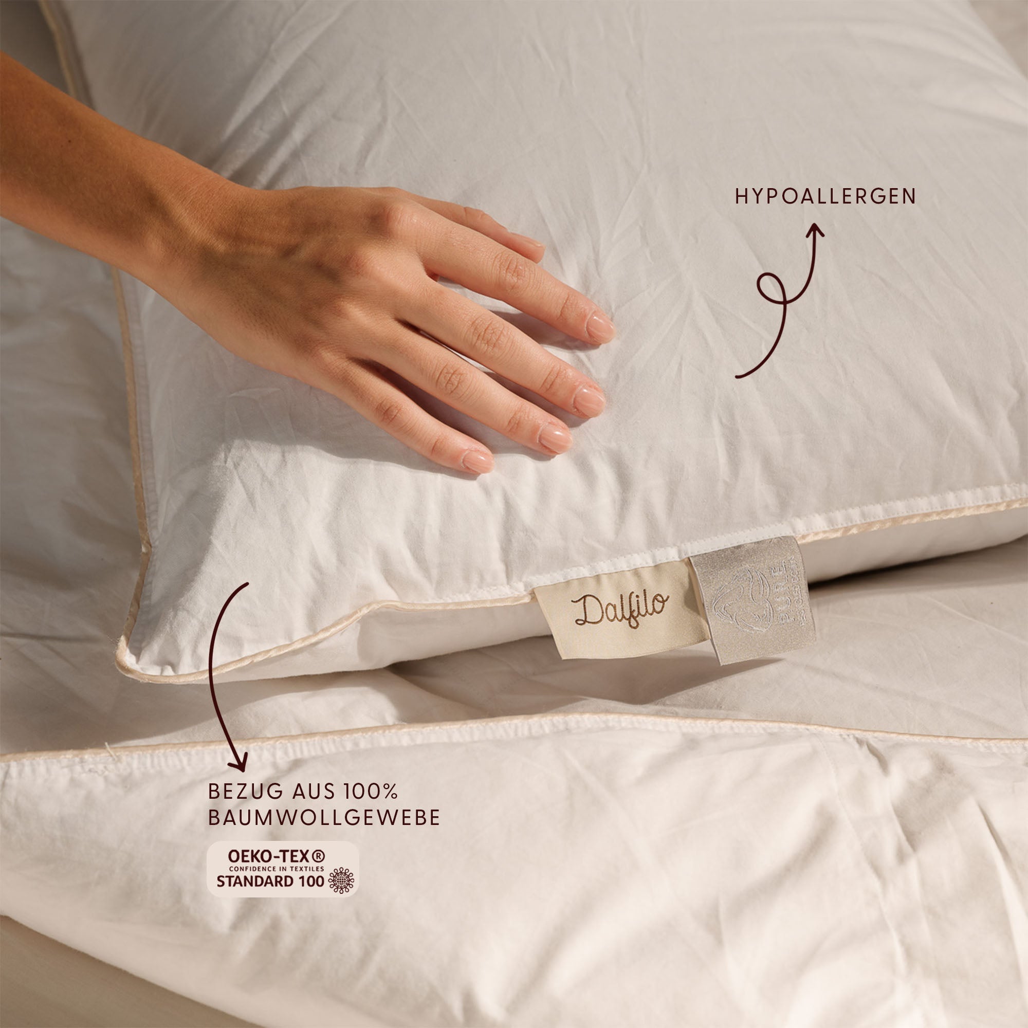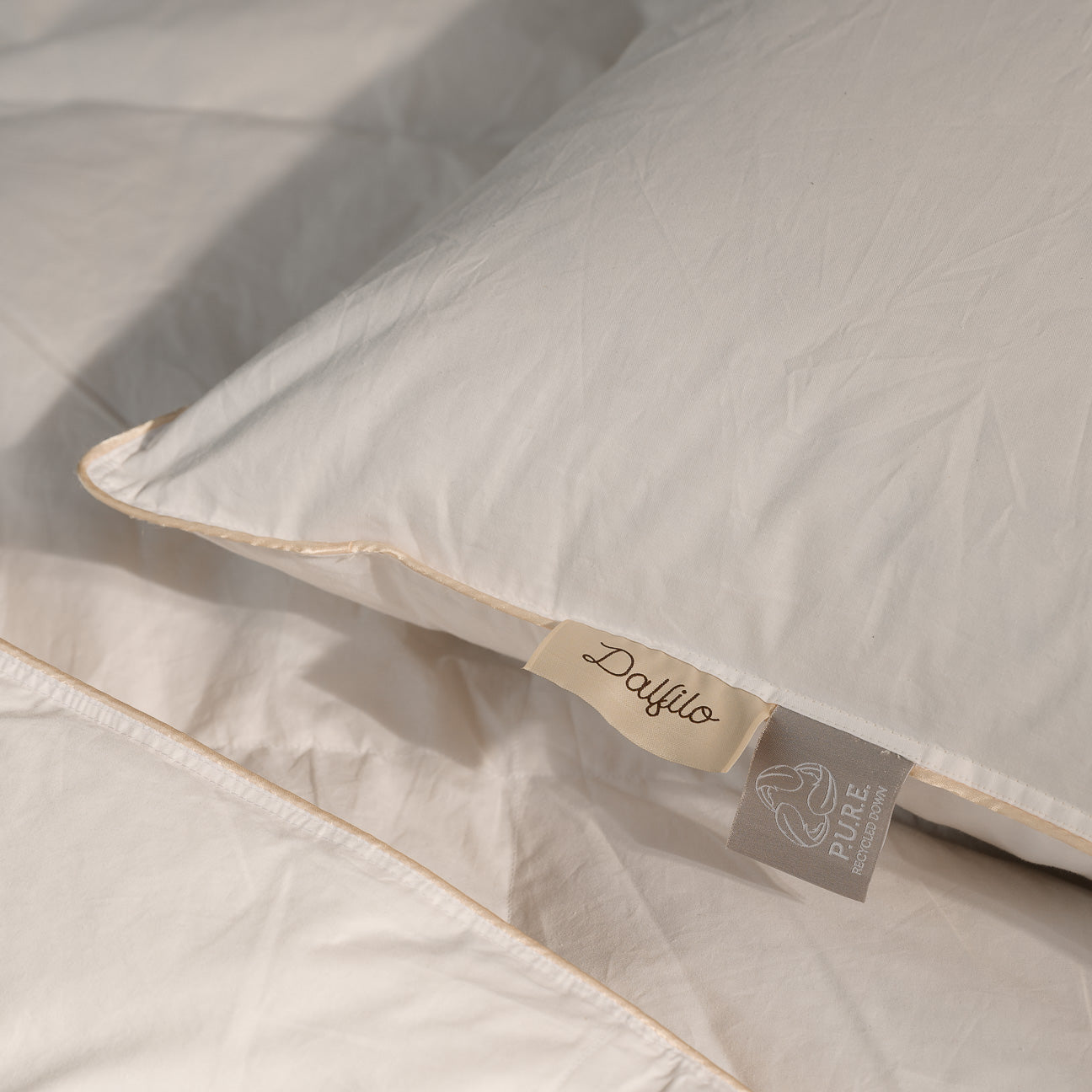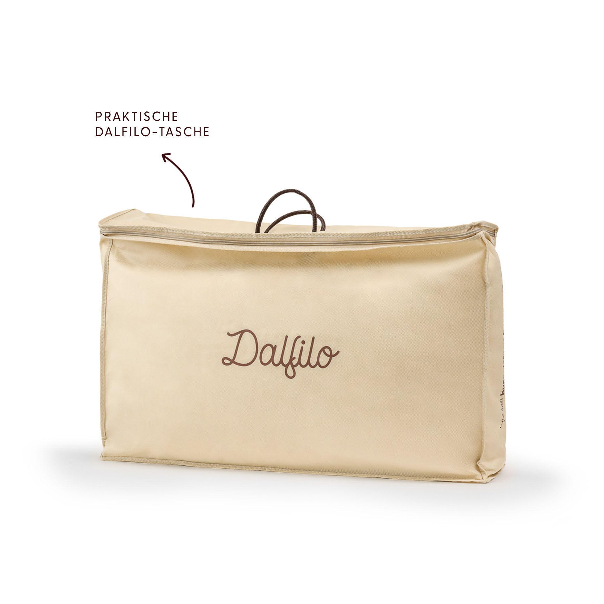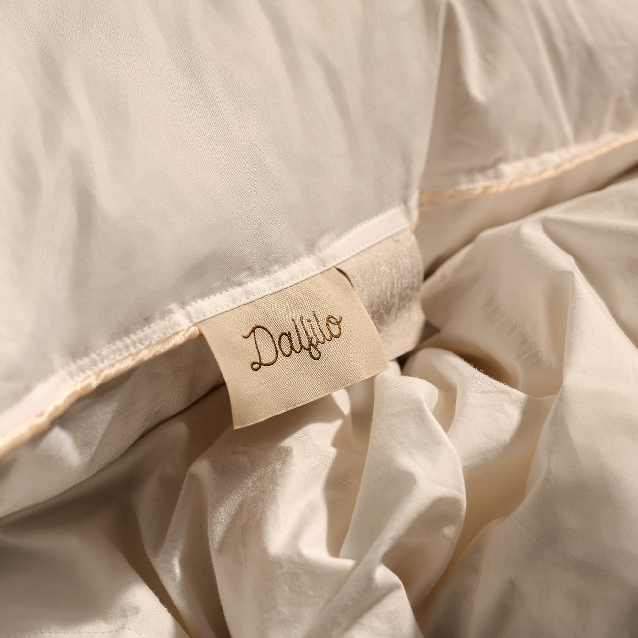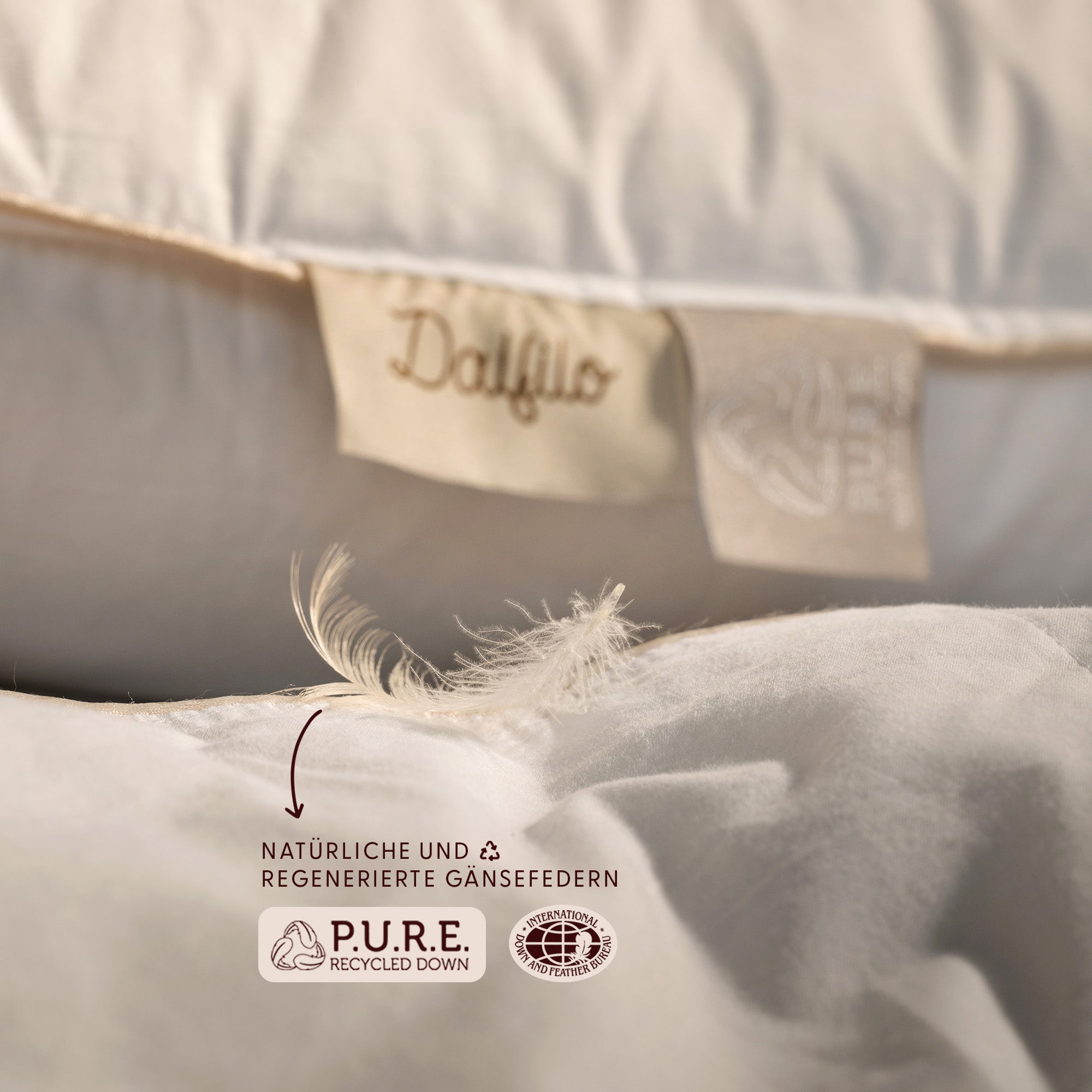 Die Eigenschaften von Gänsedaunen sind unendlich (gleichmäßige Wärme, thermische Isolierung, Resistenz gegen Bakterien und Milben), ebenso wie ihr Lebenszyklus. Aus diesem Grund werden Dalfilo-Bettdecken aus regenerierten Gänsedaunen hergestellt, das heißt, sie werden aus Produkten gewonnen, die das Ende ihres Lebenszyklus erreicht haben. Diese Daunen werden sorgfältig ausgewählt und sterilisiert, um die besten Leistungen bei minimaler Umweltauswirkung zu erzielen. Qualität und Innovation sind die Werte, die Dalfilo am Herzen liegen.