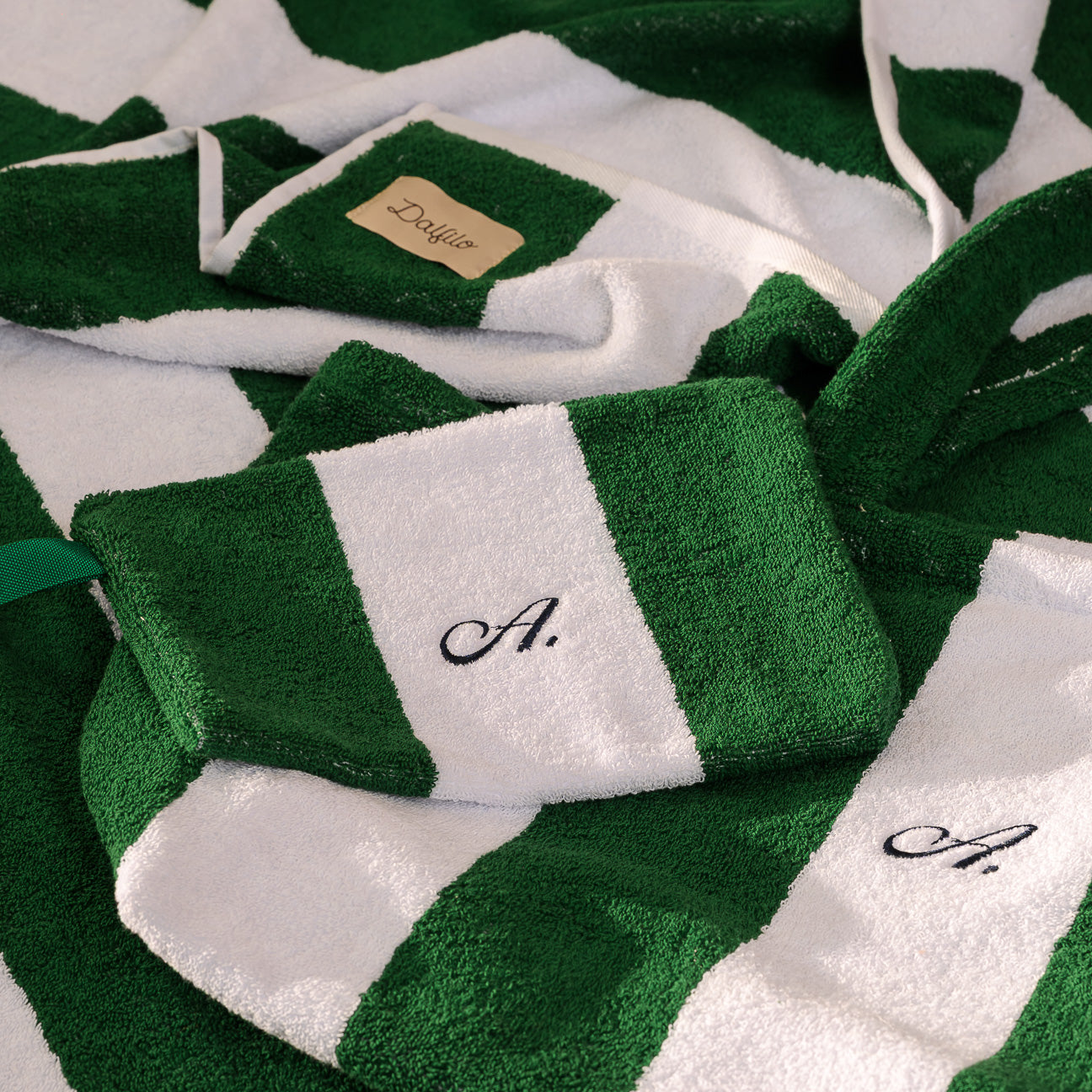 - Portofino-Strandtasche: 47 x 50 x 19 cm, ungefüttert, geräumig und leicht, mit farblich abgestimmten Frottee-Henkeln, Dalfilo-Etikett auf der Vorderseite und personalisierbarer Stickerei auf der Rückseite.
