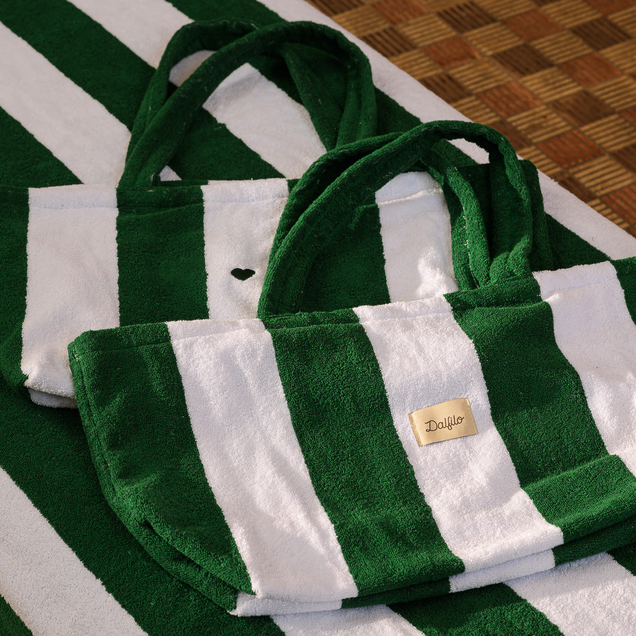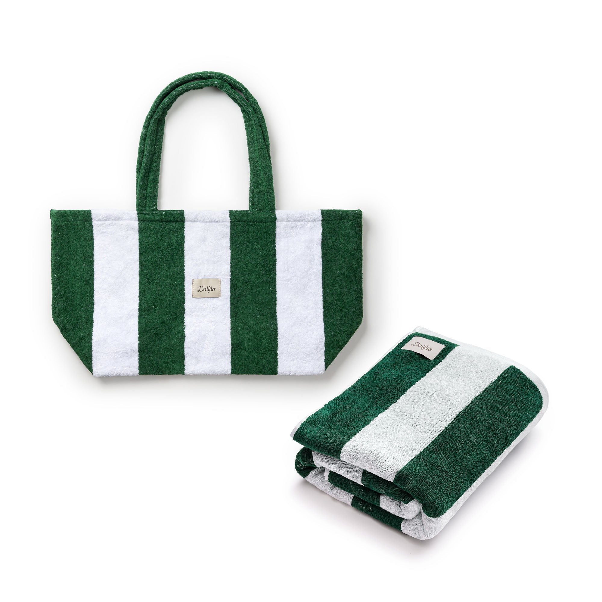 - Portofino-Strandtasche: 47 x 50 x 19 cm, ungefüttert, geräumig und leicht, mit farblich abgestimmten Frottee-Henkeln, Dalfilo-Etikett auf der Vorderseite und personalisierbarer Stickerei auf der Rückseite.